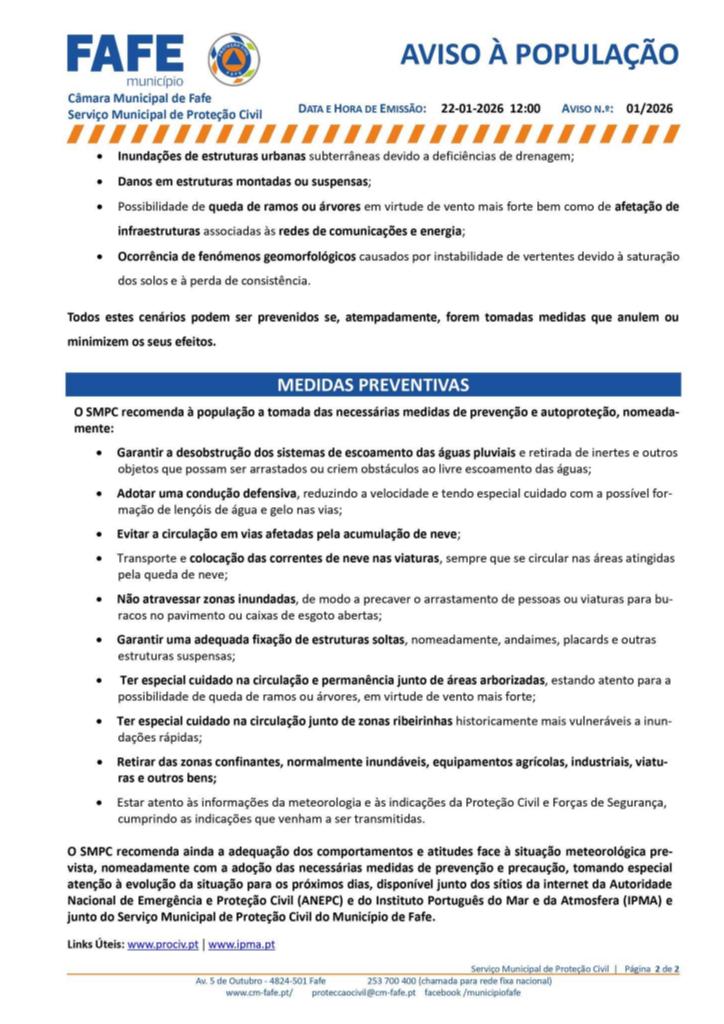 Siga as recomendações do Serviço Municipal de Proteção Civil com a tomada das necessárias medidas de prevenção e autoproteção.